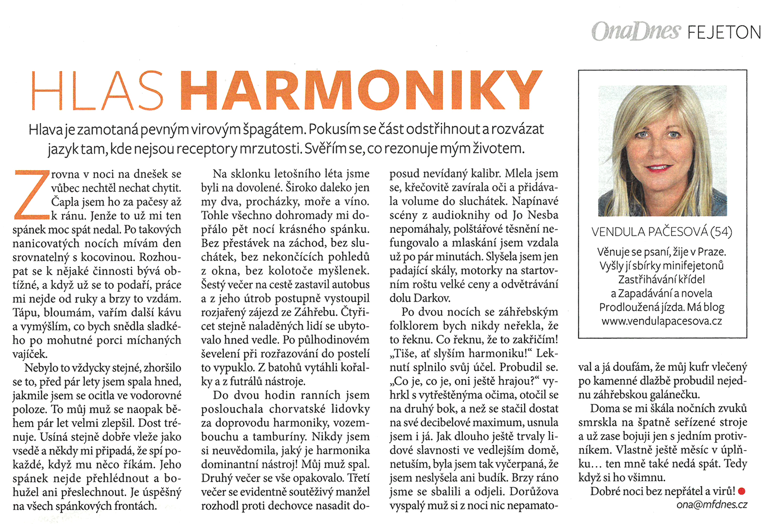 někdy se vše seběhne a sladí , tak ,že vzniká dobrý pocit , že na tom světě není zase tak špatně .Jako dnes ráno při cestě vlakem RJ do krajského města se mi dostal do rukou denní tisk ,jako bonus společnosti pana Radima Jančury ve vlaku , vždy si přečtu lidovky a MF Dnes — dnes s přílohou Ona dnes a tam narazím na nevšední zážitek při četbě fejetonu na předposlední stránce –až po vyluštění křížovky –škoda , že jsem nezačal prohlížení odzadu, zážitek a radost by přišla dříve…… fejeton upgradoval kvalitu časopisu v mých očích –nenucená četba s výborným syžetem a vtipem a nadhledem ( a změnou šatníku …) . Je mi trapně ,že jsem od autorky paní Venduly Pačesové ještě nic nečetl , nejsem také žádný knihomol … Léto bylo skutečně žhavé a na oblečení nenáročné , takže jsem vyhledával spíše zašité zatopené lomy s chladnějším obsahem….Je jich v naší republice nepočítaně a úpřinášejí zcela jiná uspokojení než aquaparky nebo vřelá moře , nedej bože termály …..V přiloženém CV na webu také narážím ,na četné shody z dětství, pamatuji si Obecnou školu s dvojtřídkou, kde se v zimě topilo uhlím v kamnech , ve kterých obyčejně končily předměty ,které se panu řediteli příliš nelíbili– hořece vzpomínám jak mi do ohně poslal zcela nově zhotovený prak s leteckou gumou ,kterou mi obstarali bratranci ostraváci z letiště…. A také mne přivedli ke hře na klarine a saxofon–kopírovala jsme skupinu Flamingu ,kterou vedl trupetista Richard Kovalčík–první manžel Marušky Rotrové …… byly to krásné prázdninové časy v hanácké vesnici …