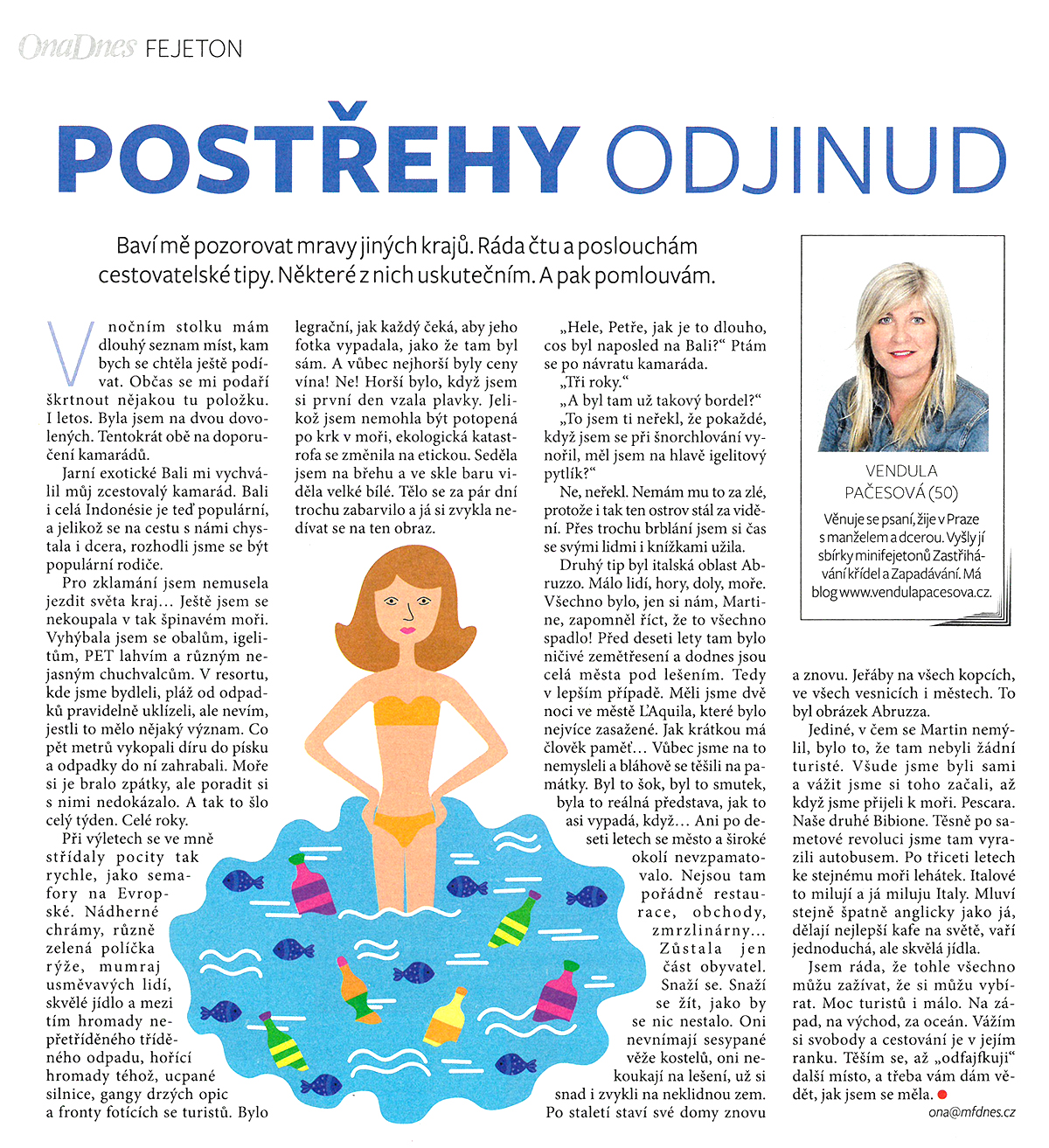 Jdu do světa. Voňavka, kabelka a KFC. To je rebelie! To je odvaz! Večer zapiju výčitky, z patnácté kabelky a ze smaženého kuřete, lahvinkou vína. Takhle ne! Na další den si ordinuju vycházku. Z ní se vracím frustrovaná ze všech těch zamilovaných dvojic a spřádám plány na další nákupy.